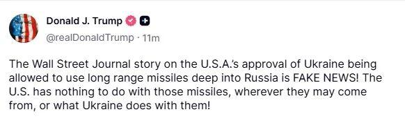 当地时间 10 月 22 日,美国总统特朗普在社交平台上发文表示,《华尔街日报》关于"美国批准乌克兰使用西方国家提供的远程导弹打击俄罗斯本土纵深目标"的报道是假新闻。